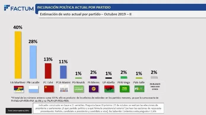 La encuesta presentada el miércoles por Factum en Televisión Nacional de Uruguay también marcó una tendencia de subida del Frente Amplio que según ese estudio registró una intención de voto del 40%, tras crecer dos puntos en relación a la medición anterior. Los blancos, en tanto, registraron una intención de voto de 28% luego de crecer un punto, al tiempo que los colorados cayeron de 16% a 13% y Cabildo Abierto creció un punto a 11%.