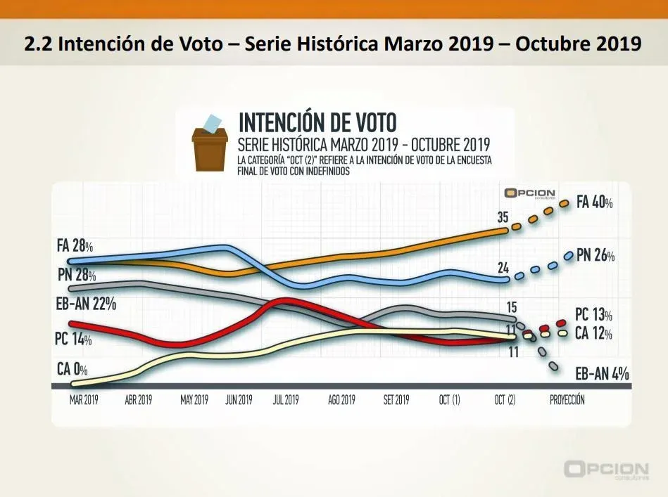 En la anterior encuesta de Opción, el Frente Amplio registró 33% de intención de voto, seguido del Partido Nacional (25%), Cabildo Abierto (12%) y el Partido Colorado (10%). En esa medición presentada en setiembre los indefinidos representaron al 16% de los encuestados, entre 9% de indecisos y 7% en blanco o anulado.