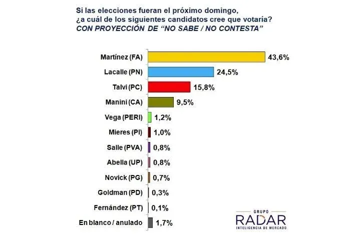 La última encuesta de Radar, también presentada este jueves, marcó que el Frente Amplio registró una intención de voto del 43,6%, seguido del Partido Nacional con 24,5%, el Partido Colorado con 15,8% y Cabildo Abierto con 9,5%. El resultado del estudio incluyó la proyección de las personas que en una primera instancia se manifestaron como indecisos.