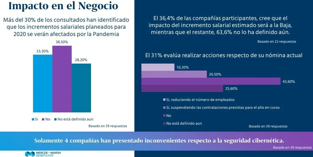 La encuesta sobre el impacto del covid-19 fue realizada por Mercer entre el 2 y el 8 de abril del 2020 y participaron 40 empresas líderes, el 90% subsidiarias de compañías multinacionales de distintas industrias (25% de consumo masivo; 17,5% high tech; 15% ciencias de la vida, entre otras).