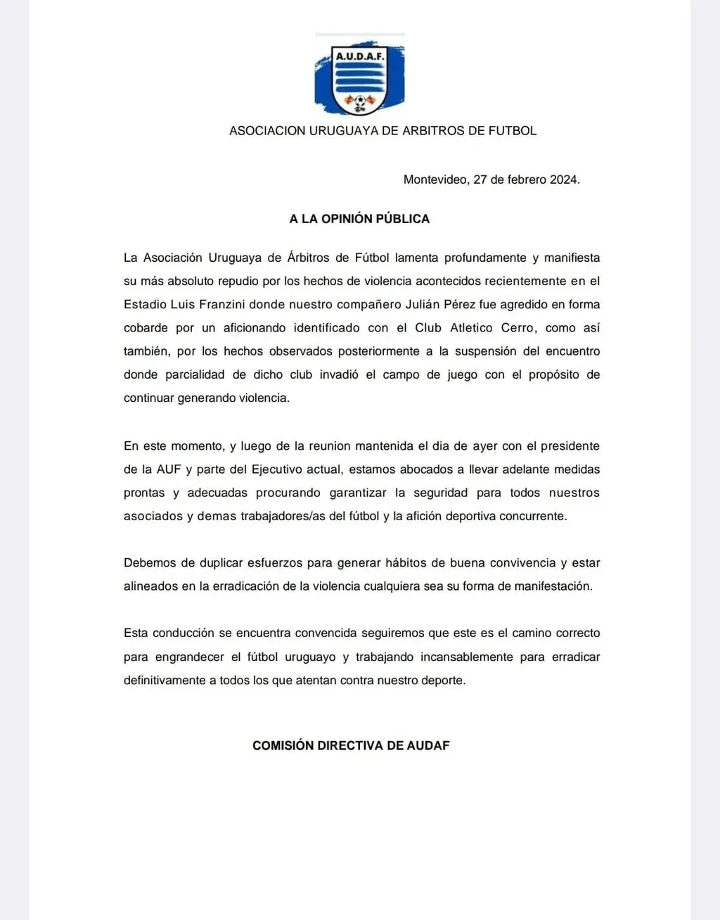 Luego de haber decidido no parar la actividad, este martes, Audaf emitió un comunicado en el que expresa lo siguiente: “Audaf lamenta profundamente y manifiesta su más absoluto repudio por los hechos de violencia acontecidos recientemente en el Estadio Luis Franzini, donde nuestro compañero Julián Pérez fue agredido en forma cobarde por un aficionado identificado con el Club Atlético Cerro, como así también por los hechos observados posteriormente a la suspensión del encuentro donde parcialidad de dicho club invadió el campo de juego con el propósito de continuar generado violencia”.