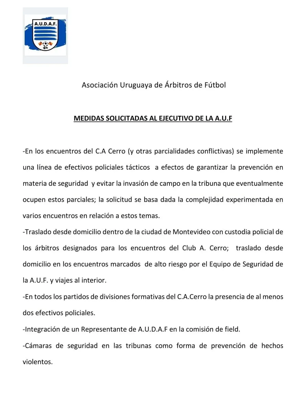 Por otro lado,. Audaf soliticó a la AUF ciertas medidas: