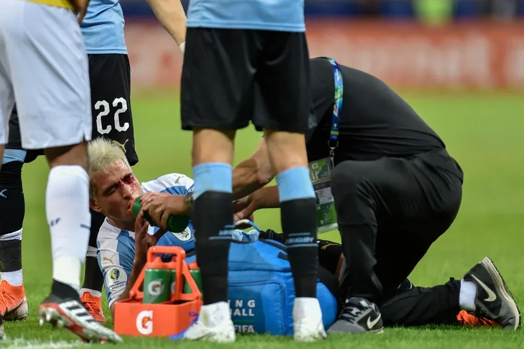 AFP Para hacerlo más héroe y guerrero, sufrió un codazo de José Quinteros, quien le provocó un corte y salió de la cancha con su rostro ensangrentado.