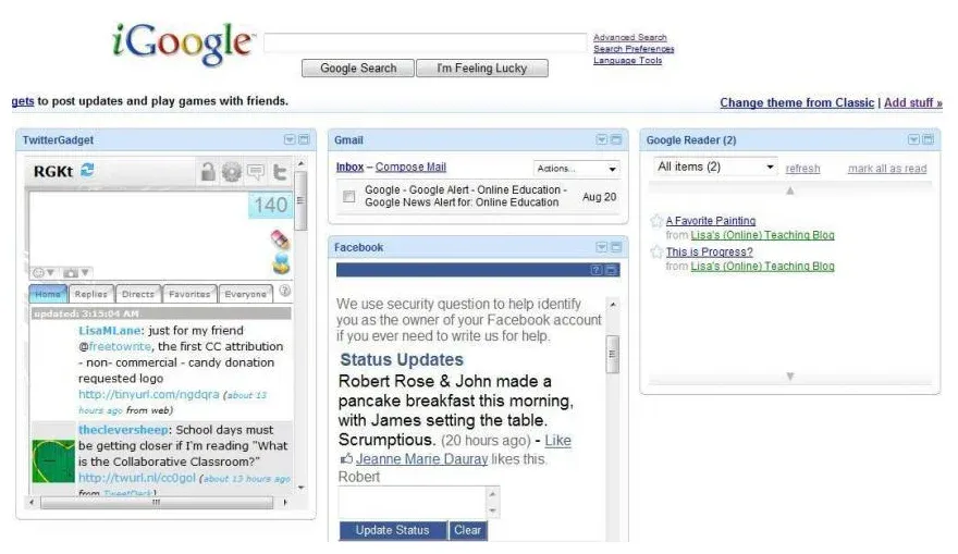 Esta página de inicio personalizada fue eliminada en 2013. Creada en 2005, iGoogle permitía a los usuarios personalizarla con widgets. Google dijo que iGoogle ya no era necesaria porque las aplicaciones podían ejecutarse en Chrome y Android.