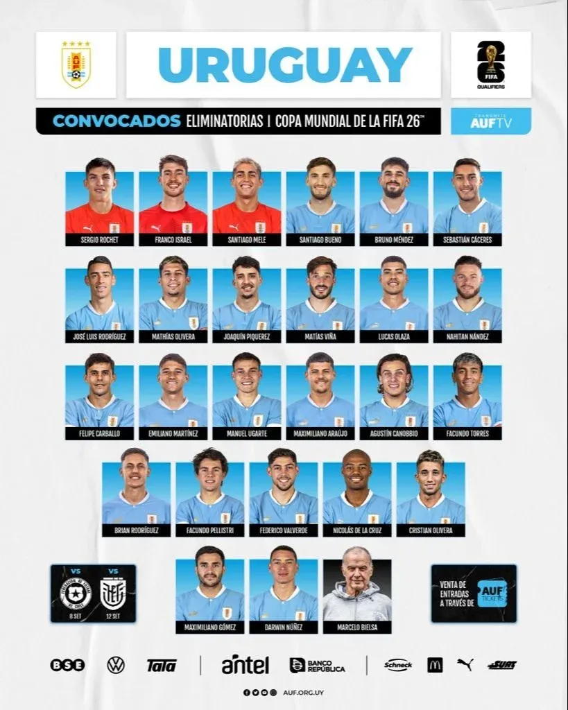 El entrenador de la selección uruguaya, Marcelo Bielsa, anunció este lunes una lista con 25 jugadores con los que afrontará los partidos ante Chile y Ecuador en el inicio de las Eliminatorias para el Mundial 2026.