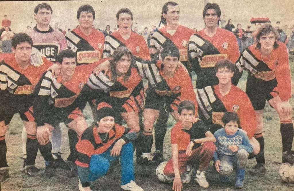 Basáñez 1993; Juanchi junto a Lucho Romero Un día un vecino lo vio jugar. Era el tío de Julio Rodríguez, entonces presidente de Basáñez, y lo invitó a probarse en el equipo rojinegro.