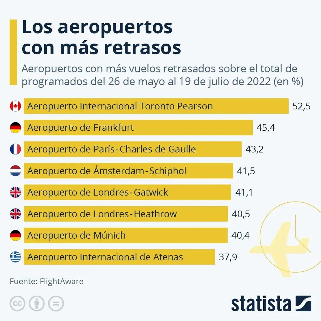 El Aeropuerto Internacional Toronto Pearson de Canadá encabeza la lista de los peores aeropuertos para volar este año, con más de la mitad de sus vuelos retrasados entre el 26 de mayo y el 19 de julio. El resto de los ocho aeropuertos del mundo con más vuelos demorados en este periodo se encuentran en Europa.
