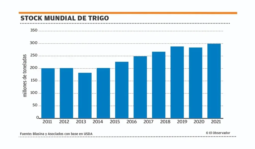 Las existencias mundiales se encuentran en niveles récord. En su informe de octubre el USDA estimó los stocks globales de trigo en 321,45 millones de toneladas, por encima de los 319,37 millones del mes pasado, y arriba de los 299,78 millones de 2019/20.