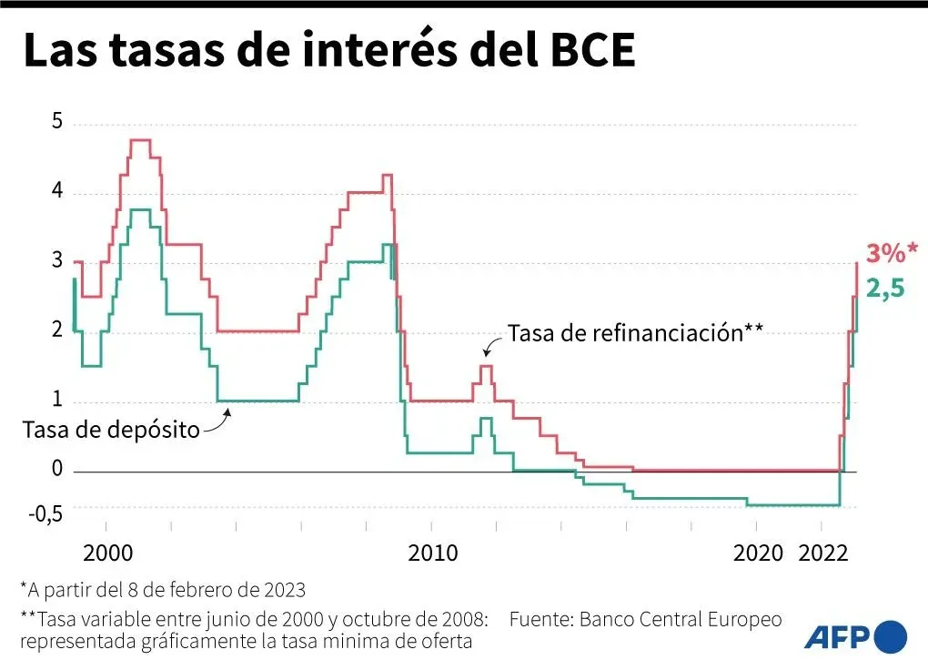 Mediante un comunicado, el BCE anunció un incremento de medio punto porcentual, lo que deja los tipos de interés que remuneran la liquidez bancaria no distribuida en forma de crédito en un rango de entre el 2,5% y el 3,25%, el más alto desde noviembre de 2008. Decisión que había sido anticipado a fines del año pasado por la presidenta de la entidad, Christine Lagarde, pero que fue acompañada por un sorpresivo anticipo que señala que volverá a hacer lo mismo en marzo.