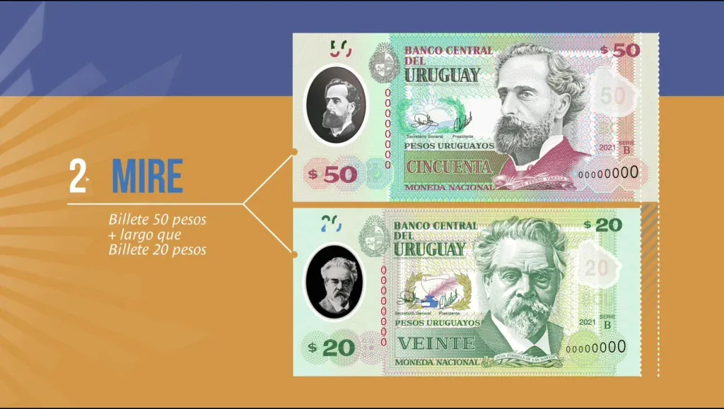 Por otra parte, los billetes de $ 20 y $ 50 conviven en su formato antiguo y en billetes nuevos fabricados con sustrato de polímero. Los mismos "poseen atributos de mayor durabilidad que los actuales, incorporan nuevos elementos de seguridad y resultan accesibles en su lectura para personas con distintas discapacidades, ya que cuanto menor es la denominación, menor es el tamaño del billete", según el BCU.