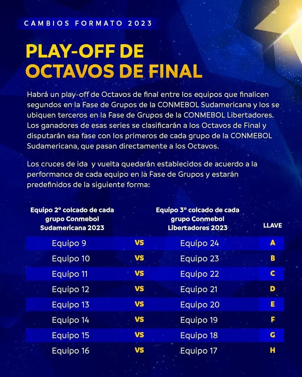 Además, la Conmebol anunció que los equipos que lleguen a segunda posición de sus grupos ya no quedarán eliminados en forma directa, sino que tendrán la chance de pasar a octavos de final, disputando un play-off con los clubes ubicados en la tercera posición de la Libertadores.