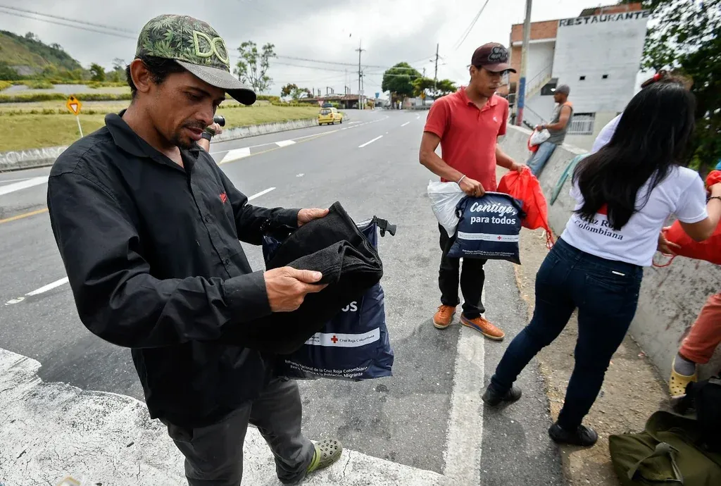 Mientras esperan un aventón que alivie la travesía, un equipo de la Cruz Roja Colombiana pasa y les deja utensilios de aseo, alimentos y abrigo.