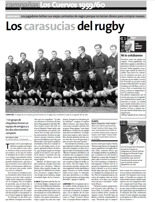 De esa época es el primer y hasta el momento único título de Los Cuervos, en el año 1960, cuando el rugby recién empezaba a despuntar en Uruguay. Fue un impulso de juveniles, que un buen día se cansaron de jugar enfrentados y armaron su club de amigos. Y apenas en el segundo año, los negros del club de golf se consagraban como el mejor equipo de rugby local.