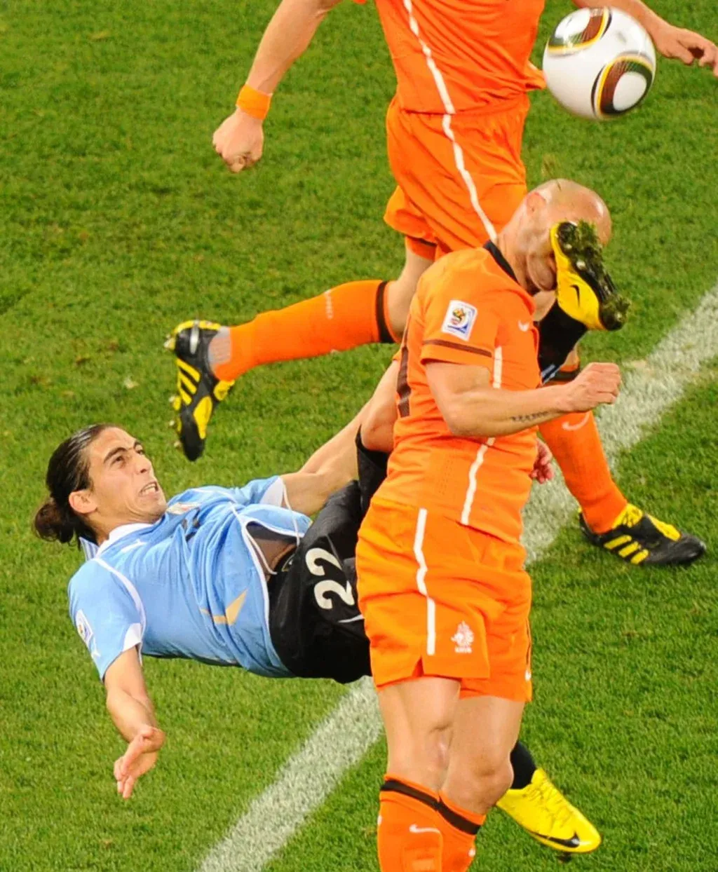 Martín Cáceres ya demostraba su poderío en el Mundial de Sudáfrica 2010, aunque aquí le da de lleno en la cara al holandés De Zeeuw