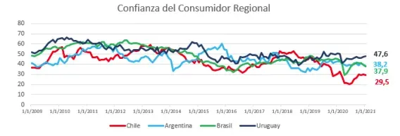 Los consumidores uruguayos arrancaron el 2021 con algo más de optimismo y se volvió a los niveles previos al covid-19, aunque todavía se mantienen en la franja de moderado pesimismo.