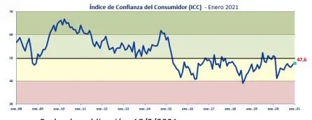 El Índice de Confianza del Consumidor (ICC) de enero 2021, elaborado en base a encuestas realizadas entre el 27 y el 29 de dicho mes, tuvo un aumento de 0,3 puntos. Así, con un puntaje de 47,6 en enero el índice cerró con su nivel más alto desde el shock covid-19 del pasado marzo. Sin embargo, el ICC continúa, por onceavo mes consecutivo, en la franja de moderado pesimismo.