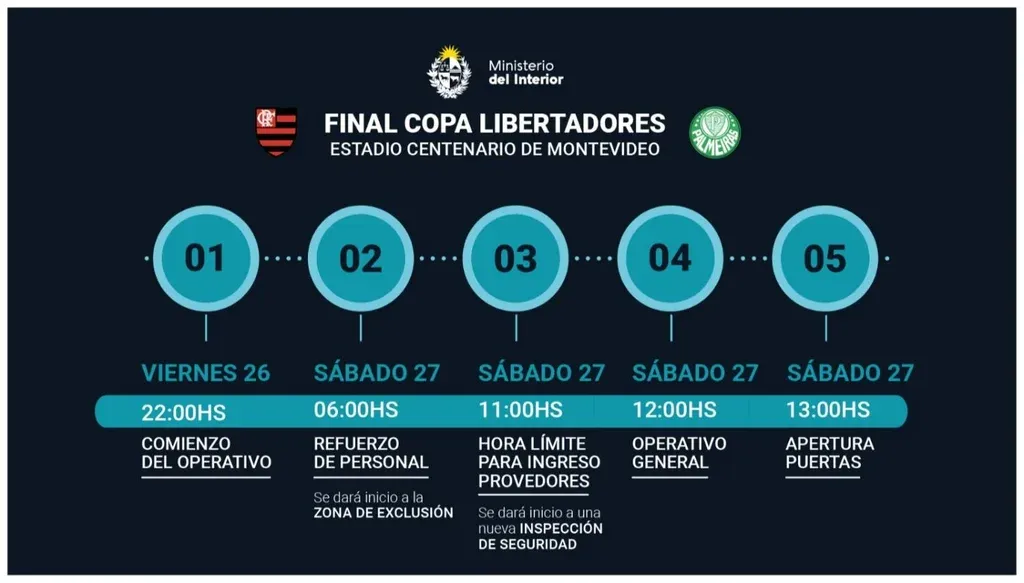 El operativo del Ministerio del Interior para la final de la Copa Libertadores 2021, que se jugará en el Estadio Centenario el próximo sábado a las 17:00 horas, tendrá su primera etapa este miércoles: el operativo de control en la frontera iniciará en menos de 24 horas, pese a que el mayor flujo de hinchas de Palmeiras y Flamengo –ambos equipos brasileños– pasará por las fronteras desde el viernes en adelante, según prevén las autoridades.