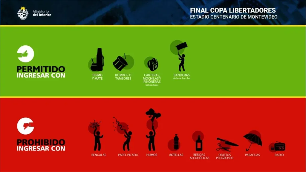 ingreso con termo y mate, bombos o tambores, carteras, mochilas y riñoneras o bolsos chicos, y banderas de hasta dos por un metro. En tanto, estará