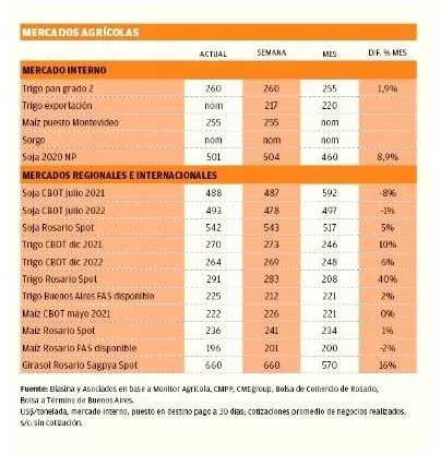 Las referencias de precios para la próxima cosecha se ubican en torno a los US$ 465 por tonelada de soja, lo que cabe apuntar puede marcar una próxima zafra con diferenciales de precios mayores a los habituales entre Chicago y Uruguay.