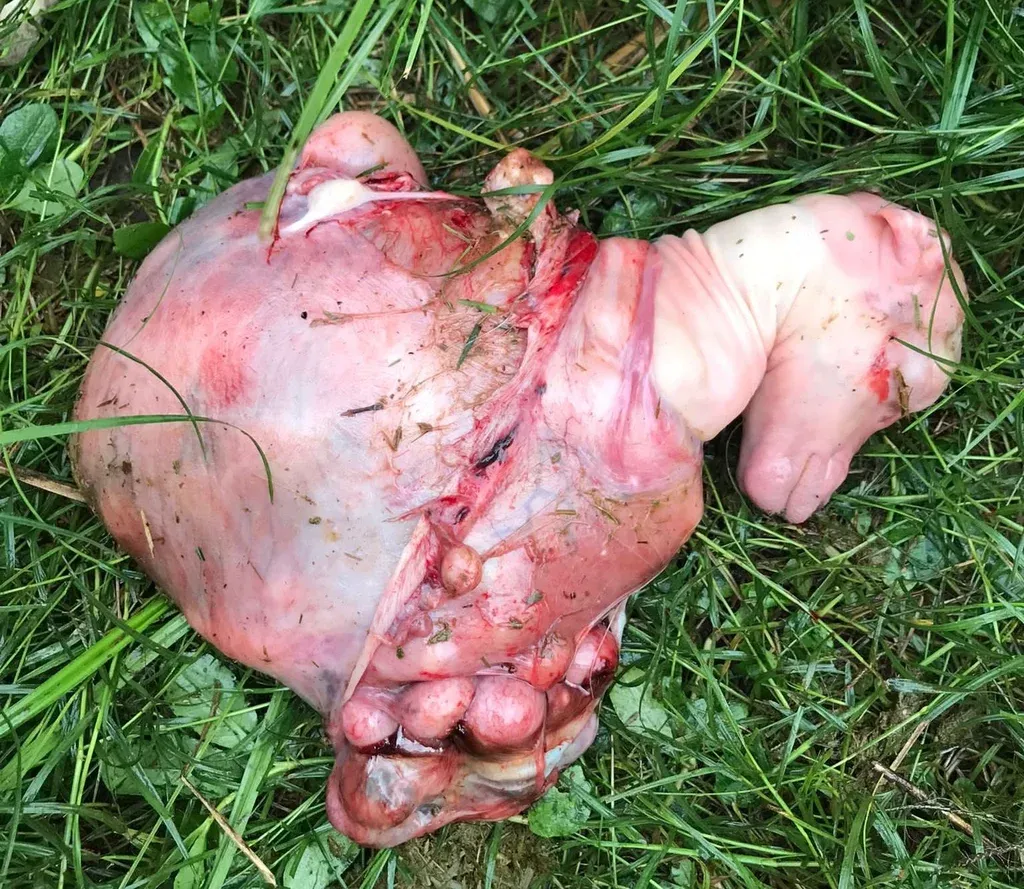 Uno de los corderos que por pocos días no llegó a nacer. Además, hay otra docena de ovinos lastimados, algunos mucho, incluso tal vez alguno no pueda recuperarse, pese a la inversión extra que el productor está realizando en tiempo y dinero para tratar con antibióticos las heridas causadas por los perros.
