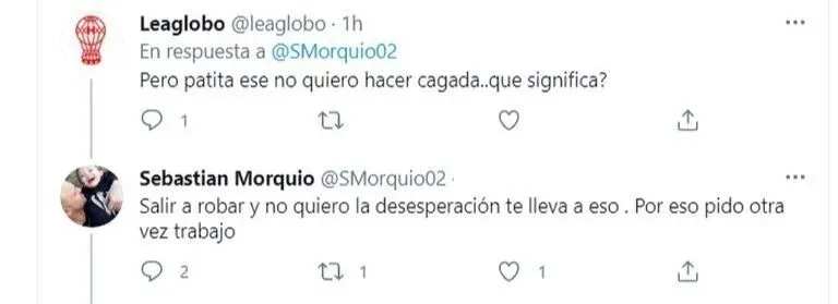 La contestación de Morquio a un seguidor de Twitter Horas después, Morquio sostuvo: "quiero trabajo y ver a mi hijo nada más simple . Hace dos años no lo veo y quiero verlo decirle 'Te Amo'. Está mal ..me siento impotente por no verlo y no quiero perjudicar en su vida, pero sigo siendo el Padre".