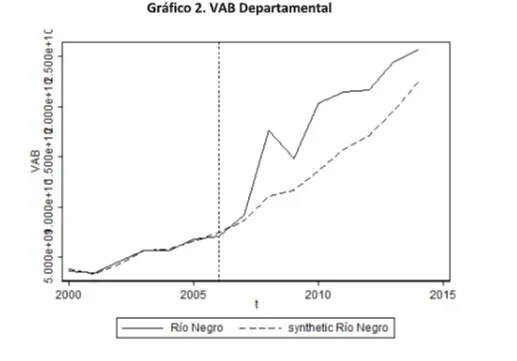 El contrafactual, llamado “Río Negro sintético”, es un promedio ponderado de los otros departamentos (excluyendo Montevideo) que no recibieron grandes inversiones o las experimentaron en momentos distintos en el tiempo. Bajo ciertas condiciones, esta metodología permite construir un control adecuado para establecer vínculos causales en la evaluación del impacto sobre las variables de interés. Para algunas variables, no es posible estudiar el impacto del tratamiento (la inversión en la planta de UPM Fray Bentos), ya que la evolución de estas variables no puede ser replicada adecuadamente en el período anterior a la inversión.