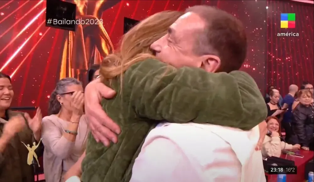Con El viejo de La Vela Puerca como cortina musical, la pareja entró al estudio, donde Tinelli siguió con los elogios. Luego de abrazarlo, el conductor le dijo "Por ahí él no me cree, pero te admiro mucho, todo lo que hacés me parece muy divertido, conducís muy bien en la tele".