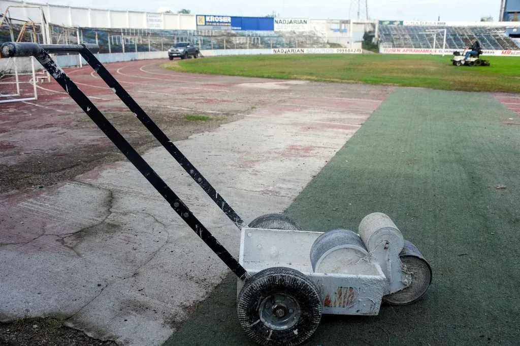 “Esta máquina sirve para marcar la cancha. Antes de esto se hacía a rodillo, con un palo en la punta. Y además una vez por mes viene Javier, el mismo que trabaja en el Estadio Centenario, con una máquina especial y realiza una remarcada que te deja la pintura fija y tira las líneas como van”.