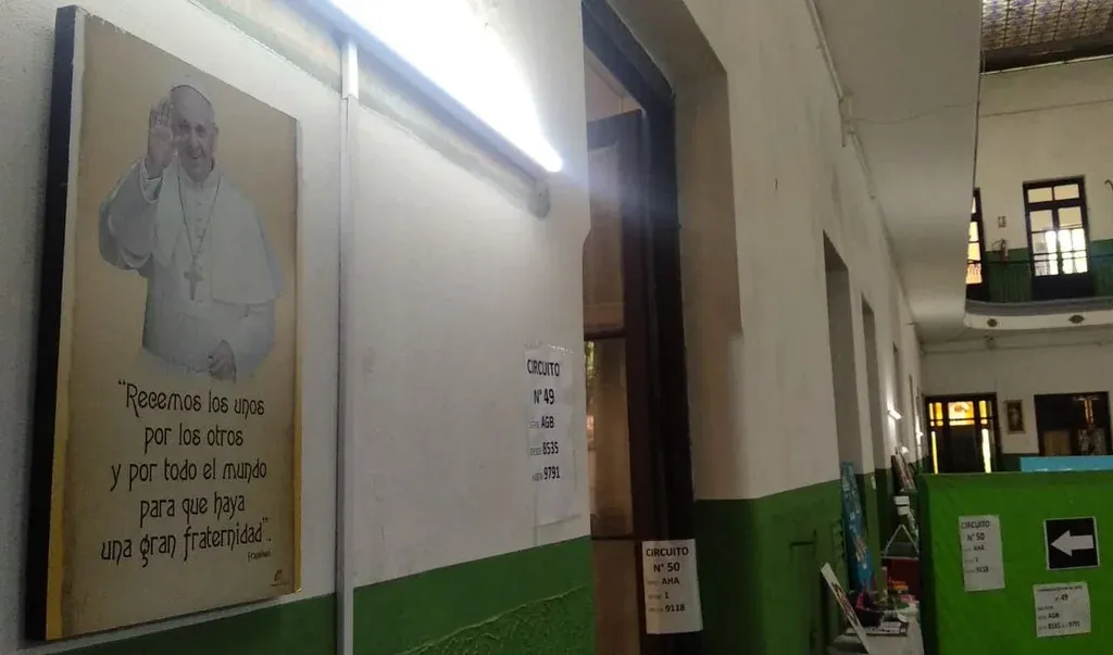 “Recemos los unos por los otros y por todo el mundo para que haya una gran fraternidad”, dice uno de los cuadros del Papa Francisco que cuelga al costado de la puerta de los circuitos 49 y 50 del Colegio Nuestra Señora del Huerto, ubicado en la calle San José esquina Julio Herrera y Obes, entre los barrios Sur y Centro.