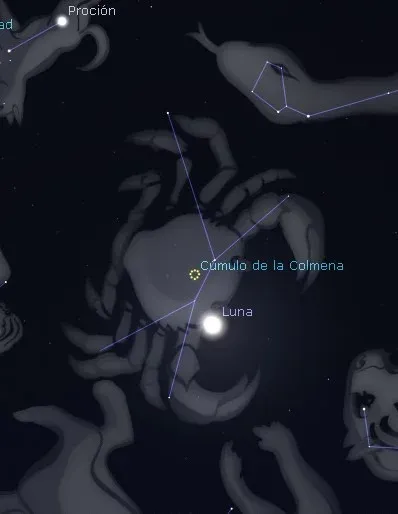 Desde la medianoche con la salida de la Luna hasta el amanecer, se verá cercana a ella el cúmulo abierto de La Colmena (M44). Un cúmulo estelar abierto es un grupo asimétrico de estrellas formado a partir de una misma nube molecular. En este caso el Cúmulo de la Colmena, también conocido como El Pesebre, está situado en la constelación de cáncer y es uno de los cúmulos abiertos más cercanos a la Tierra.