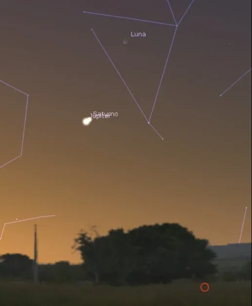 Durante el atardecer, se podrá observar un acercamiento aparente entre la Luna (iluminada un 17%), Júpiter y Saturno. Para percibirla deberás mirar hacia el occidente.