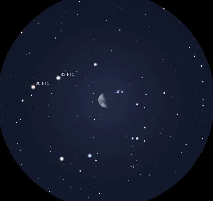 Las imágenes que aparecen en esta nota son obtenidas con el software Stellarium, en algunos casos simulando el campo de unos binoculares 10x50 y en otros el cielo a simple vista.