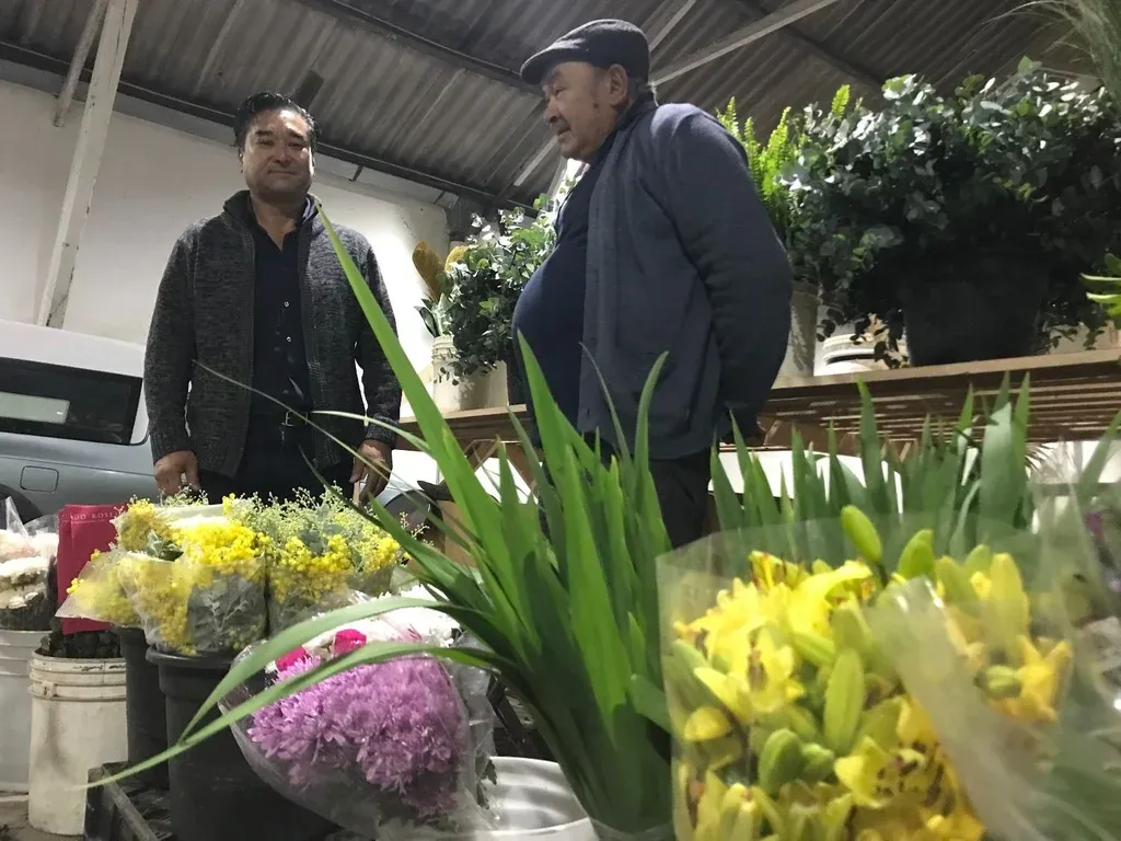 Juan Samuelle Gastón Hideo en su puesto, en el Mercado de Flores.e Presidente de los floricultores