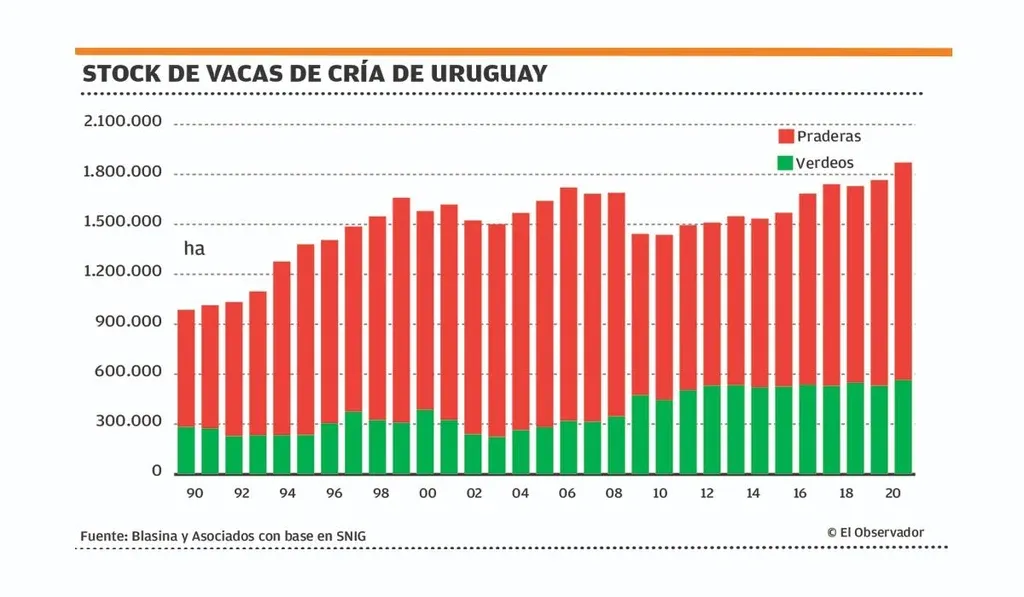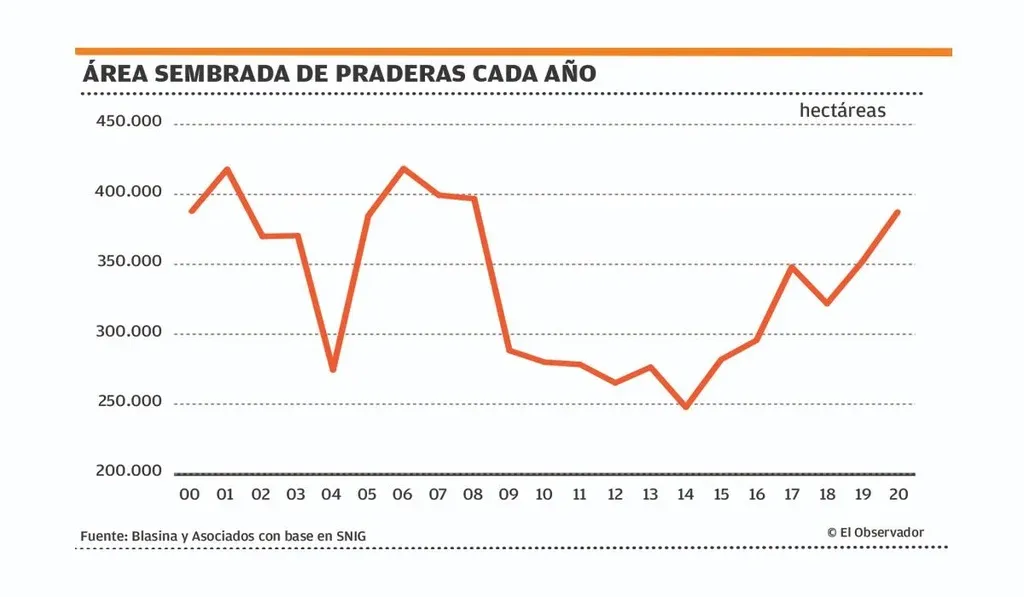 Por ejemplo, en 2020 Uruguay alcanzó la mayor área cubierta por praderas convencionales y verdeos desde que se empezaron a llevar registros, en 1974. Parecen ir en paralelo la disposición a aumentar la cantidad de vientres, terneros y mejoramientos forrajeros. Tras una fuerte caída en el área de praderas de Uruguay en 2009, cuando se unieron una baja de precios y una sequía, la agricultura forrajera creció 30%.