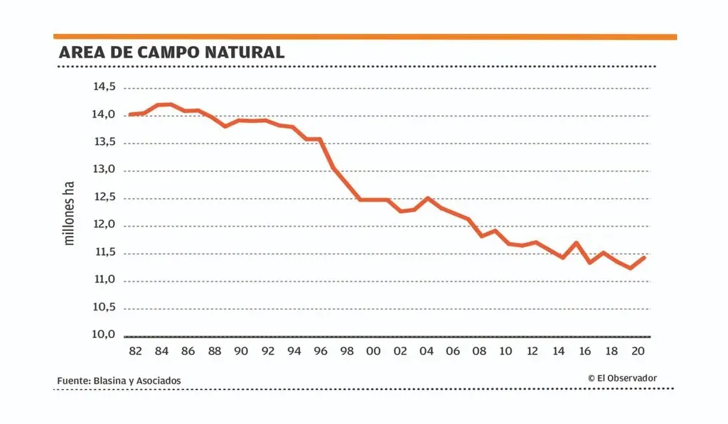 El área que ocupa el campo natural se mantiene en los niveles más bajos registrados, y es la contracara de la expansión de los cultivos forrajeros. El campo natural totalizó 11.426.736 ha, 493.518 ha menos que las 11.920.254 de hace 10 años.
