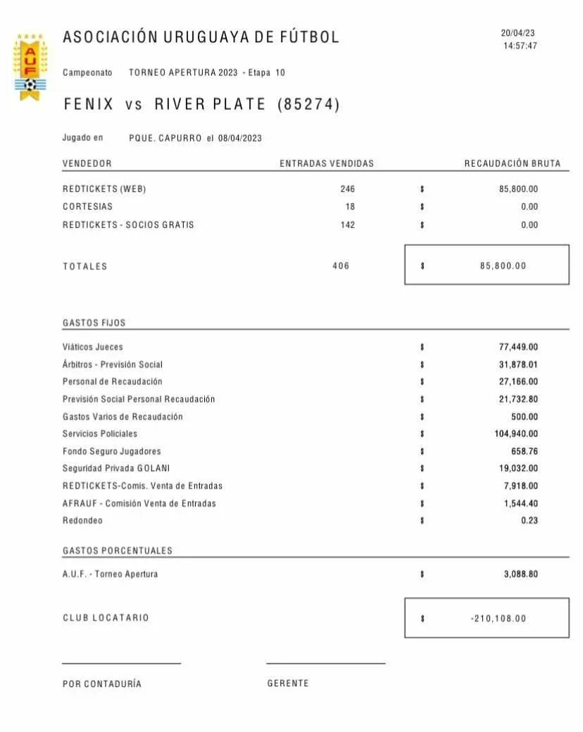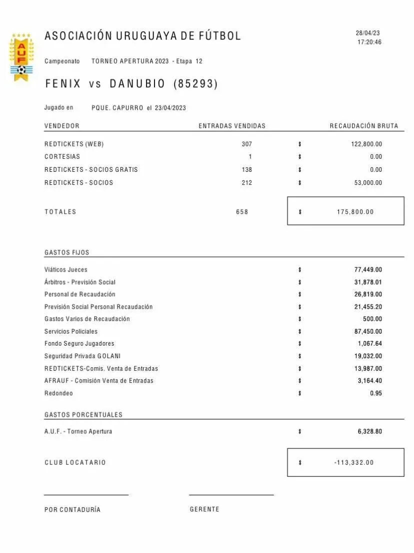 De acuerdo al desglose de ingresos y egresos que la AUF le envió a Fénix, ante Danubio vendieron 658 entradas. Por los servicios de Policía y seguridad desembolsaron $ 106.482, que se repartieron en $ 87.450 en gastos de Policías y $ 19.032 en seguridad privada.