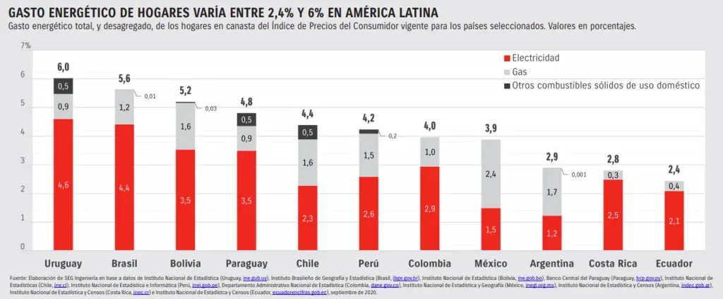 Los hogares uruguayos destinan un 6% del gasto promedio a la energía y son los que le destinan más recursos a este rubro en América Latina. El 4,6% lo destinan a la electricidad, el 0,9% al gas y el 0,5% a otros combustibles sólidos de uso doméstico, según los datos del Instituto Nacional de Estadística (INE) consignados por la consultora Seg Ingeniería.