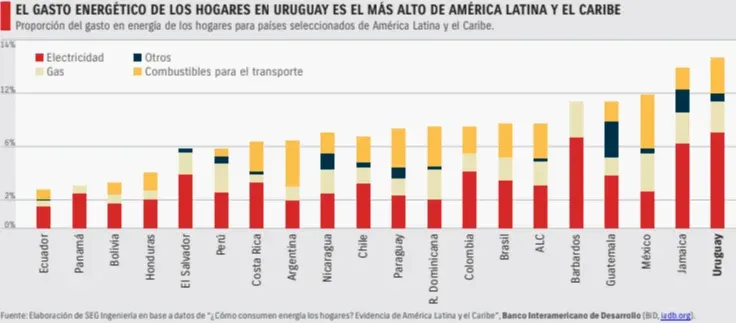 En América Latina y El Caribe, la energía representa el 8% del gasto total de los hogares, siendo el segundo mayor desembolso del sector, superado únicamente por el realizado en alimentos, pero como se puede observar en el gráfico de la parte superior, el peso de la energía varía según el país. El gasto en energía para los hogares en Ecuador representa el 2,9% del gasto total, mientras que para los hogares en Paraguay es del 7,7% y en México del 10,3%. En Uruguay el expendio energético llega al 13,1% del gasto de los hogares, y es 5,1% superior al promedio y el mayor entre los países de ALC.