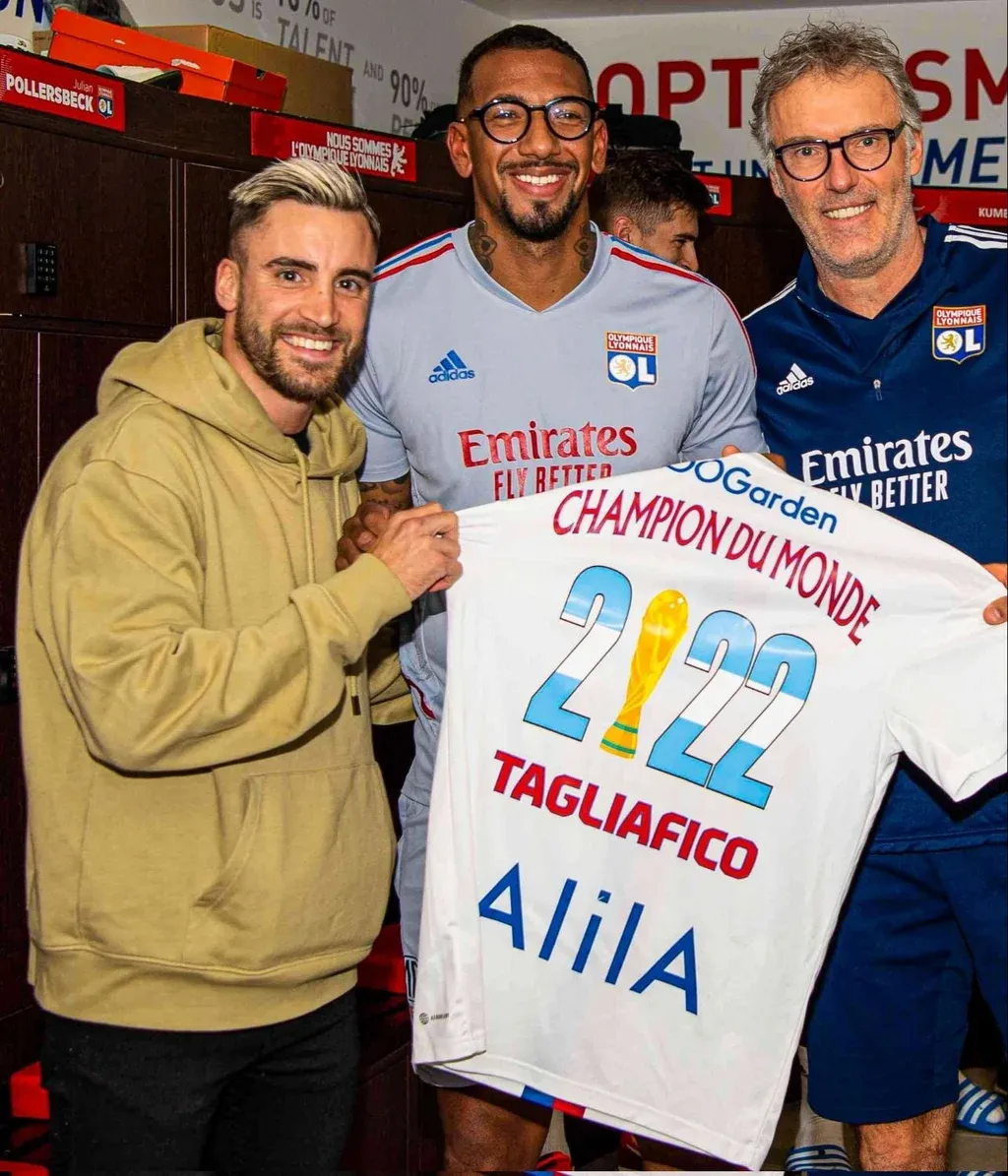A Nicolás Tagliafico lo recibieron en el Olympique Lyon con aplausos y una camiseta distintiva para reconocerlo, con la Copa del Mundo y los colores de Argentina en los números.