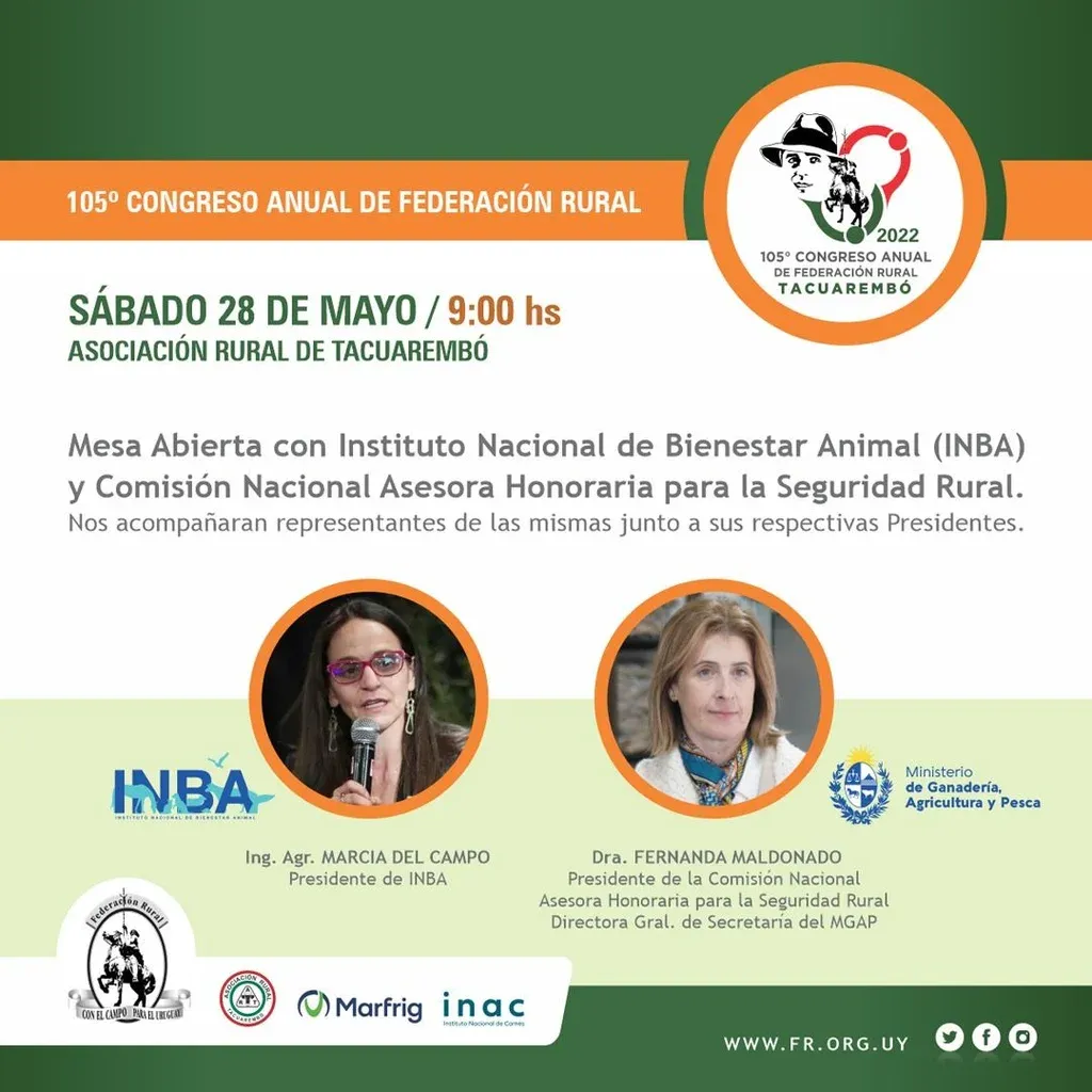 Ya anunció su asistencia Fernando Mattos, ministro de Ganadería, Agricultura y Pesca (MGAP). Otras presencias ya confirmadas son las de Fernanda Maldonado, directora general de la Secretaría del MGAP y presidenta de la Comisión Nacional Asesora Honoraria para la Seguridad Rural; Marcia del Campo, presidenta del Instituto Nacional de Bienestar Animal (INBA); Robert Silva, presidente del Codicen; Leonardo Cipriani, presidente de ASSE; Gabriel Gurméndez, presidente de Antel; y Guillermo López, presidente del Congreso Nacional de Intendentes.
