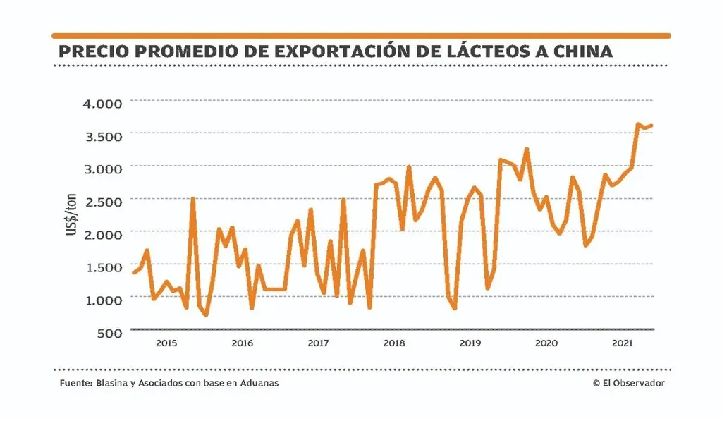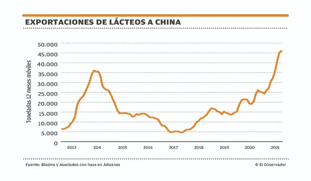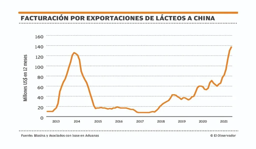 Entre enero y julio China importó 2,655 millones de toneladas de lácteos, un salto de 30% interanual, de acuerdo a datos publicados por el sitio especializado CLAL. Uruguay se ha convertido en su tercer principal proveedor de leche en polvo entera, detrás de Nueva Zelanda –en un lejano primer lugar– y Australia.