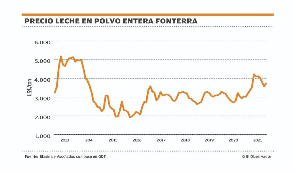 4.011 dólares por tonelada es la última referencia internacional de precio promedio para todos los lácteos –Global Dairy Trade– valor muy superior al del inicio de enero de 2021 (US$ 3.420); en setiembre hubo dos subas: 4% y 1%.