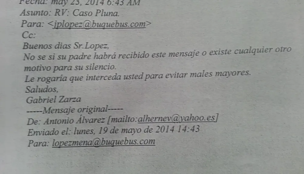 “Buenos días Sr. López, No sé si su padre habrá recibido este mensaje o existe cualquier otro motivo para su silencio. Le rogaría que interceda usted para evitar males mayores. Saludo, Gabriel Zarza”, expresa el mail enviado el 23 de mayo por el gerente general de Cosmo a Juan Patricio López Mena.