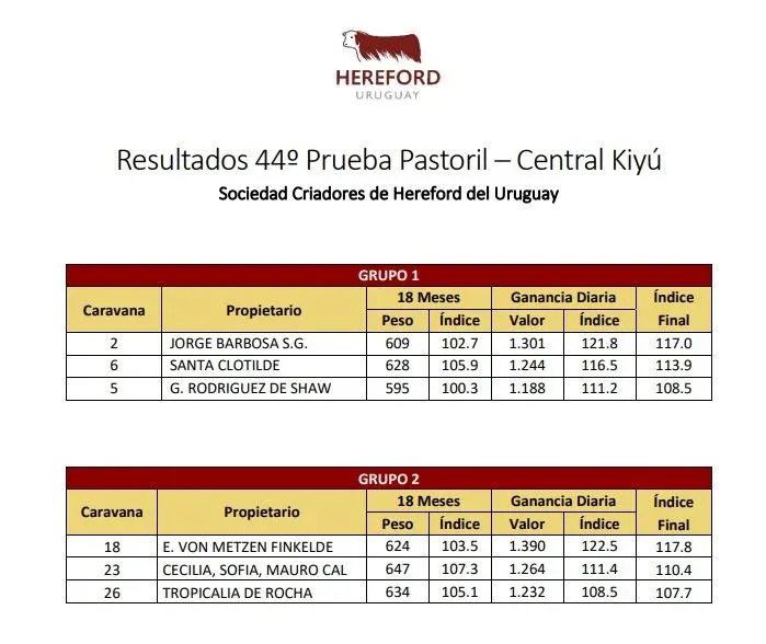 Las cabañas correspondientes a las firmas Jorge Barbosa SG en el Grupo 1 con el toro caravana 2 y E. Von Metzen Finkelde en el Grupo 2 con el toro caravana 18, ambas de Lavalleja, fueron las ganadoras en la 44ª Prueba a Pasto organizada por la Sociedad de Criadores de Hereford del Uruguay (SCHU), en cuyo tramo final participaron reproductores de 28 cabañas, en la Central de Pruebas que esa gremial de criadores posee en Kiyú (San José).