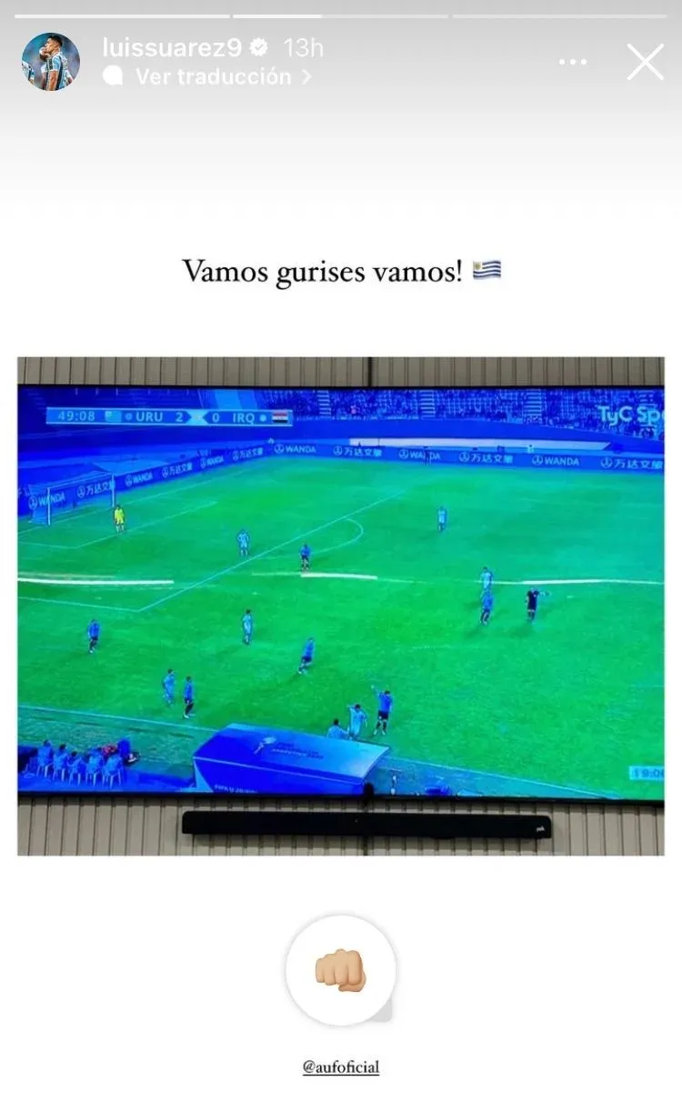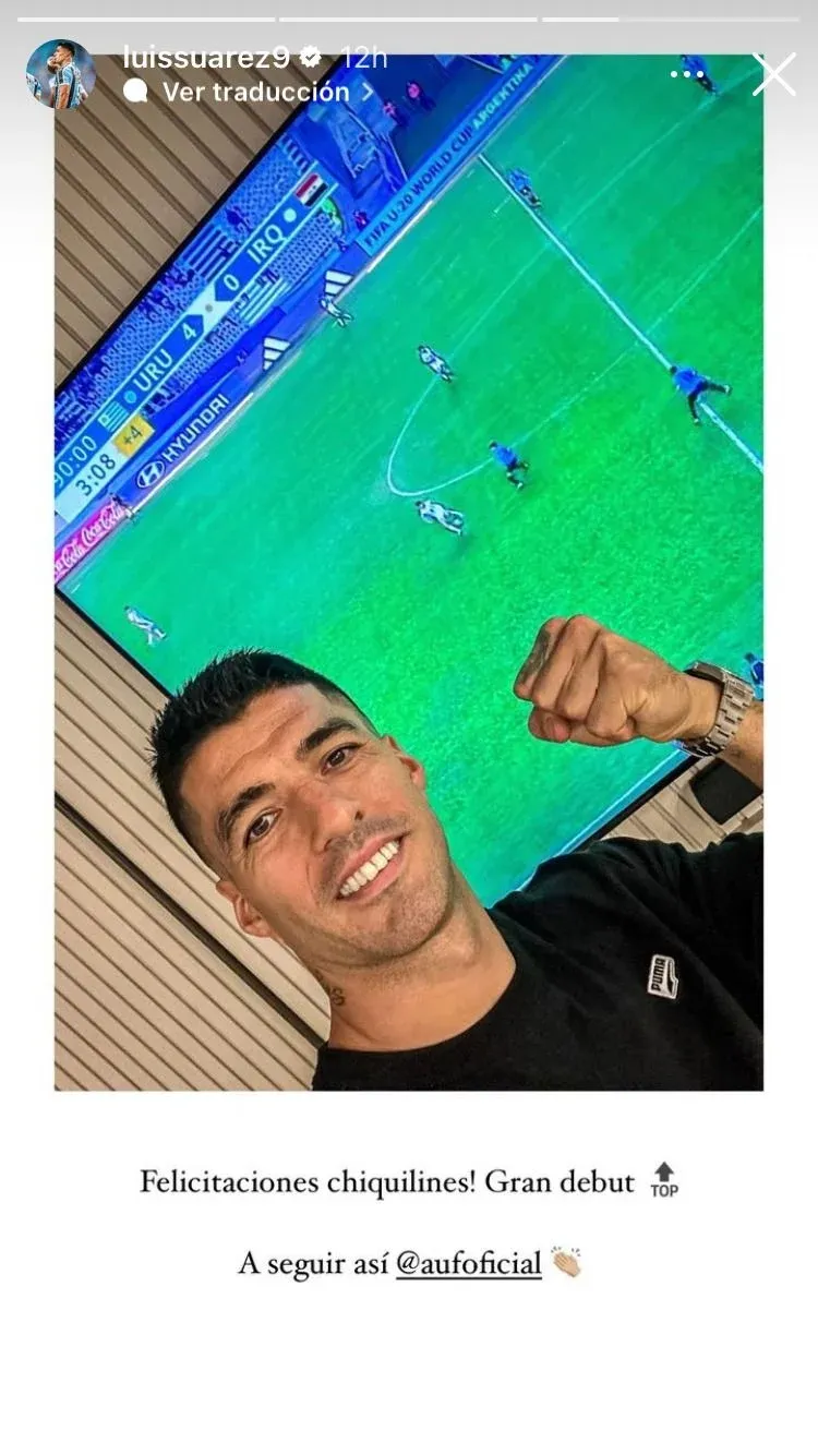 Este lunes la Sub 20 ganaba 2-0 en el inicio del segundo tiempo del partido que se jugó en La Plata, cuando Suárez escribió en Instagram: "Vamos gurises vamos", junto a una fotografía del televisor con el partido.