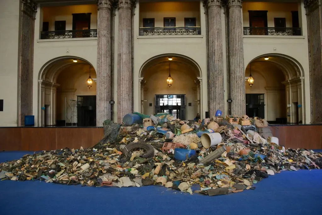 Esta es la primera vez que Out to sea? The Plastic Garbage Project llega a América Latina y el escenario que lo recibe es la Casa Central del Banco República (BROU). Allí, una montaña de basura acapara la atención. Se trata de una representación de la cantidad de basura que puede ingresar al océano cada 10 segundos. Y a lo largo de la sala, se disponen distintas secciones donde se concientiza sobre distintos aspectos de la contaminación plástica.
