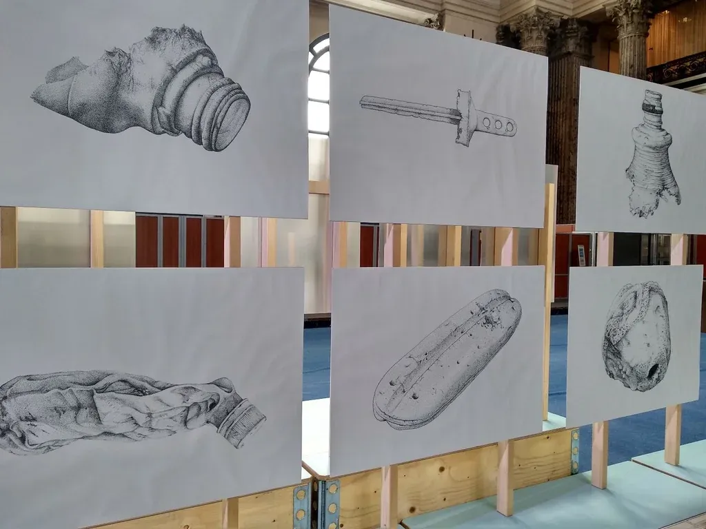 Como el museo trabaja en conjunto con la universidad de las Artes de Zúrich, alumnos de este centro participaron de la creación de algunas obras. Una de las primeras secciones del montaje contiene ilustraciones que retratan cuál sería el legado arqueológico de la humanidad actual en los siglos siguientes. Así como se sabe que hace millones de años las personas subsistían de la caza y la pesca por las herramientas que se descubrieron fosilizadas después, en el futuro se podría suponer que la extinción de ciertas especies marinas tuvo que ver con que el habitante del siglo XXI prefirió abusar del consumo de productos plásticos antes que cuidar el medio ambiente.