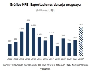 El incremento esperado en la producción de soja para esta campaña se explica por un aumento de 15% en el área sembrada (980.6909 ha) y por expectativas de rendimiento promedio mayores a 2.400 kg/ha. La mayor área sembrada y la mejora en el rendimiento por hectárea permitiría alcanzar una producción cercana a los 3 millones de toneladas en 2022, según un informe de Uruguay XXI.