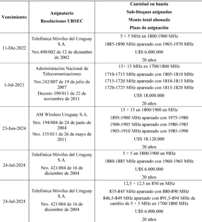Así, en el período 2022-2025 se cumple el plazo de 20 años de diversas asignaciones del espectro radioeléctrico realizadas a favor de Antel, Movistar y Claro. Por ejemplo, el próximo 11 de diciembre caduca el plazo de una licencia de Movistar por 20 años para los bloques en 1800/1900 Mhz por el cual pagó US$ 6 millones en su momento. En tanto, el 1° de julio finaliza un contrato con Antel para 1700/1800 Mhz por el cual la empresa estatal pagó US$ 18 millones por un plazo de 20 años. También en junio finaliza un subloque del espectro de la compañía Claro por el cual desembolsó US$ 18,12 millones.