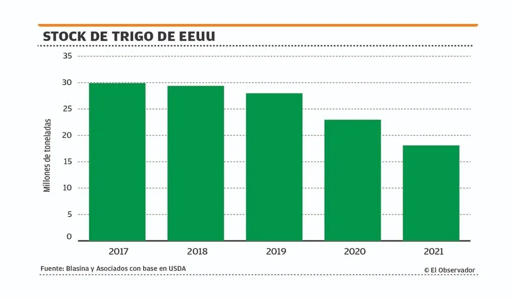 La perspectiva mundial del trigo para 2021/22, aunque con stocks amplios a nivel global, muestra cómo sigue perdiendo volumen la producción estadounidense y eso se hará notar en el mercado. Tiene un impacto directo sobre la cebada en Uruguay que asegura un precio interesante. Y también naturalmente para el trigo uruguayo, que como pocas veces puede asegurar un precio de US$ 220 por tonelada apenas sembrado.